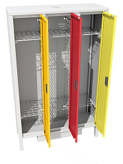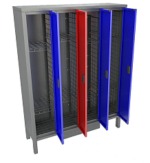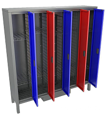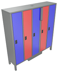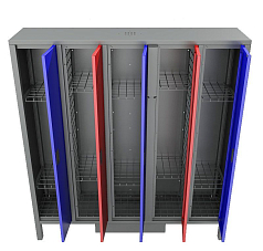 Прямоугольный корпус с цветными одностворчатыми дверями оснащается отдельными секциями, в каждой из которых по 2 полки. Отделения предназначаются для спортивной формы, аксессуаров, экипировки, головных уборов.