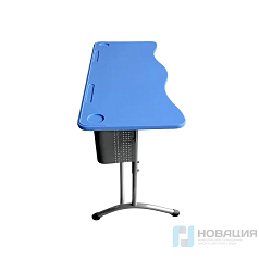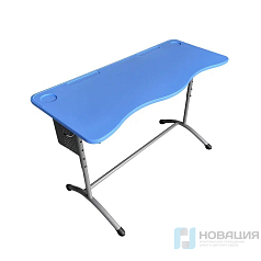 Поверхность стола представляет собой пластиковый лист толщиной 25 мм, закрепленный на металлической раме посредством винтов. Конструкция дополнительно оборудована защитным экраном из перфорированной стали и удобными крючками для сумок и рюкзаков. В поверхности стола предусмотрено анатомическое углубление, комфортное для рук, а также специальные углубления для канцелярии.