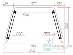 Стол занимает участок размером 1280х544 мм. Столешница имеет форму трапеции с боковыми сторонами длиной 600 мм и 700 мм, основанием длиной 1280 мм. Углы и верхние кромки столешницы из ЛДСП скруглены.