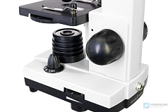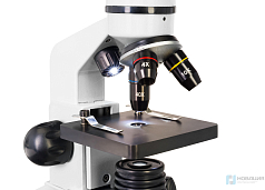В комплекте 2 осветителя. Нижний подходит для наблюдения прозрачных образцов, а верхняя подсветка позволяет рассматривать непрозрачные. Для удобного исследования окулярная трубка наклонена под углом 45°. Подсветка работает не только от сети переменного тока, но и от батареек.