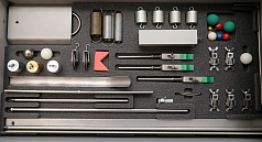 Под столешницей есть выдвижной ящик и отделение для лабораторного оборудования с дверцей. Дверца и ящик с фурнитурой запираются на замок. Напольная тумба состоит из пяти выдвижных ящиков, которые закрываются на ключ.