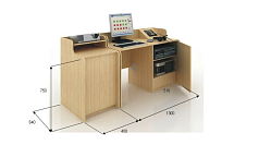 - Компьютерный стол с коммутационным оборудованием (ЛДСП (16мм), цвет бук, размеры стола (ШхГхВ): 1300х640х750 мм, размеры тумбы (ШхГхВ): 400х640х750 мм). (Тумблер включения и выключения, табло регулировки уровней сигнала программ по 3-м каналам.)