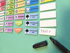Постепенно яркие подсказки заменяются рукописным текстом (ребенок использует пустые карточки (инструмент для письма в комплект не входит)). Элементы легко переставляются. Несменяемый стандартный шаблон способствует запоминанию действий, подготавливает к чтению любого классического листа расписания.
