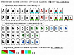 - Набор магнитных карточек для фонетического разбора, размеры - 70х70 и 70х105 мм - 25 карточек синего, красного и зеленого цвета для фонетического обозначения букв и слогов.