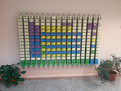 В кабинете химии квест-стена посвящается открытиям Д.И. Менделеева. На гранях кубов школьник видит названия химических элементов.