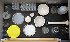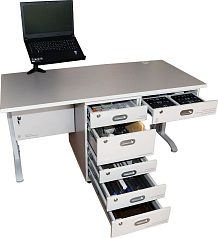 Под столешницей есть выдвижной ящик и отделение для лабораторного оборудования с дверцей. Дверца и ящик с фурнитурой запираются на замок. Напольная тумба состоит из пяти выдвижных ящиков, которые также закрываются на ключ.