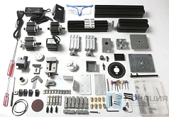 Набор состоит из готовых металлических модулей, позволяющих собрать следующие виды станков: токарный (для обработки дерева и металла), фрезерный, сверлильный, шлифовальный, координатно-фрезерный, заточной и пилу-лобзик.
