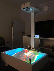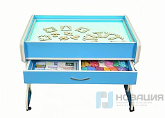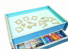 Стол-парта оснащается подсветкой и дополнительными отсеками. Такая мебель позволяет рисовать песком, заниматься лепкой, собирать мозаику. Материалы поставляются вместе с оборудованием и хранятся внутри. RGB-подсветка управляется при помощи пульта.