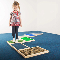 Модули отличаются по степени плотности, шероховатости поверхностей. Дополнительным плюсом является то, что ребенок получает возможность прикоснуться к материалам, имитирующим природные неровности.