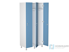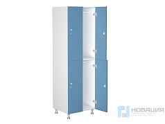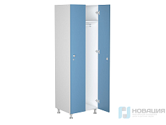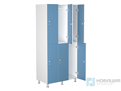 Изделие из пластика HPL подходит для хранения водного инвентаря и одежды. Каждая секция прямоугольного корпуса оборудуется верхней и нижней полками, крючком, штангой для вешалок и дверцей на механическом замке.