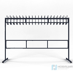 На верхней перекладине держатся вешалки-плечики с одеждой. Напольное изделие покрывается полимерно-порошковым защитным слоем. Вандалоустойчивое гардеробное вешало открыто для доступа с обеих сторон.