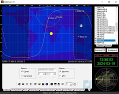 - Показ орбиты спутника с отметками времени и зоной покрытия (видимости);