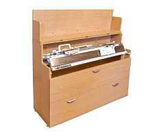 3-местный стол для вязания используется в школьном кабинете домоводства и технологии. Специальная мебель с выдвижным узлом и фиксацией приводится в рабочее положение за несколько секунд.