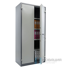 Корпус и двери шкафа выполнены из стали толщиной 0,8 мм, максимальная нагрузка на шкаф составляет 500 кг, а на полку – 80 кг. Шаг регулирования высоты полки – 50 мм.