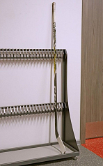 Стойка для хоккейных клюшек размещается в школе. Инвентарь хранится в отдельных ячейках. Основание изготавливается из фанеры. Конструкция покрывается влагостойкой краской. Расстояние между клюшками составляет 1,5 см.