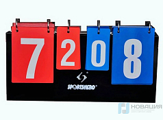 Для обозначения результатов команд используются контрастные цвета. Крупные изображения цифр отчетливо видны на белом фоне перекидных карточек. Числа для ведения счета двузначные.