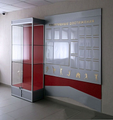 Композиция подходит для демонстрации спортивных достижений коллектива. Набор состоит из 2-х модулей витрины и стенда с карманами.