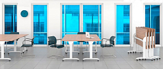 Парта может складываться в вертикальное положение и фиксироваться, после чего ее возможно передвинуть на колесах и освободить помещение. Готовые столы без труда перемещаются благодаря высококачественным немецким колесным опорам D 50 мм. Благодаря мягкой шине из резины колесо не оставляет следов на твердом покрытии и не шумит. Все 4 колеса оснащены стопорами для фиксации стола в рабочем положении.