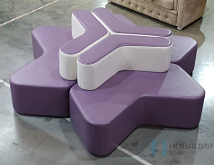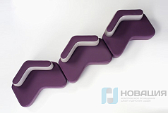 Модули разных конфигураций выстраиваются в цепочку. Каркас каждого пуфа оклеен ППУ и обтянут чехлом, который дезинфицируется и моется без последствий. Высота пластиковых опор составляет 25 мм.