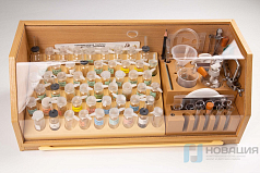 - 1 набор для учителя (540х240х230 мм). Контейнер-укладка с сухими реагентами, растворами во флаконах, посудой и принадлежностями, учебным пособием, паспортом. В состав включены тест-системы для определения содержания веществ (аммиак, pH, активный хлор, общее железо, медь, нитраты).