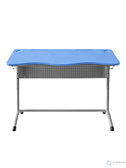 Столешница выполнена из пластика и крепится к металлическому каркасу винтами. Она не имеет кромки и пленки, а также оборудована углублениями для кружки и ручки. Уровень наклона столещницы регулируется до 15 градусов.