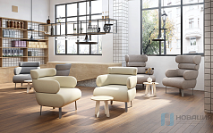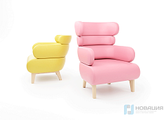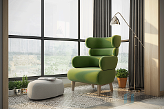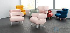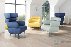 Кресло оснащено подлокотниками и эргономичной спинкой из нескольких секций. Размещается на четырех опорах.