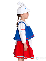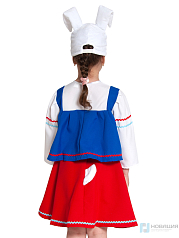 Детский костюм предназначен для девочек. Состоит из блузки, юбки с фартуком и маски-шапочки в виде головы зайки. Может использоваться для постановки спектаклей, сценок и костюмированных представлений.