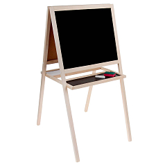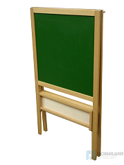 У мольберта для письма и рисования 2 рабочие поверхности: меловая и магнитно-маркерная. Очищаются влажной губкой. Конструкция опирается на 4 ножки, поля расположены под углом. Канцелярия помещается на нижнюю полку. Прямоугольные отделения есть с обеих сторон.