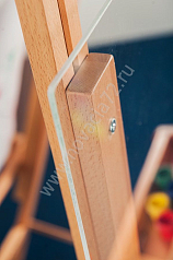 Угол наклона фиксируется стопорной планкой. Подвижные элементы мольберта можно легко регулировать для удобства отдельного ученика. В нижней части планшета прикреплена полка для канцелярских принадлежностей и для установки картона.