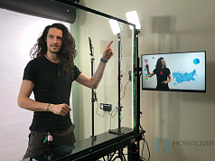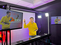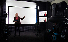 Студия с стеклянной доской диагональю в 75 дюймов предназначена для проведения онлайн-уроков и трансляций в формате FullHD. Доска регулируется по высоте имеет объем видеопамяти 4гб. В состав комплекта входит RGB LED подсветка стекла и LED подсветка спикера в диапазоне 4400-6200К для большего вовлечение в процесс урока.