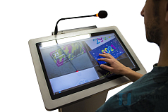 Трибуна не требует длительной установки и отличается мобильностью и компактностью. Позволяет транслировать фото, видео и презентации. Может использоваться в комплекте с интерактивными панелями, проекторами, досками.