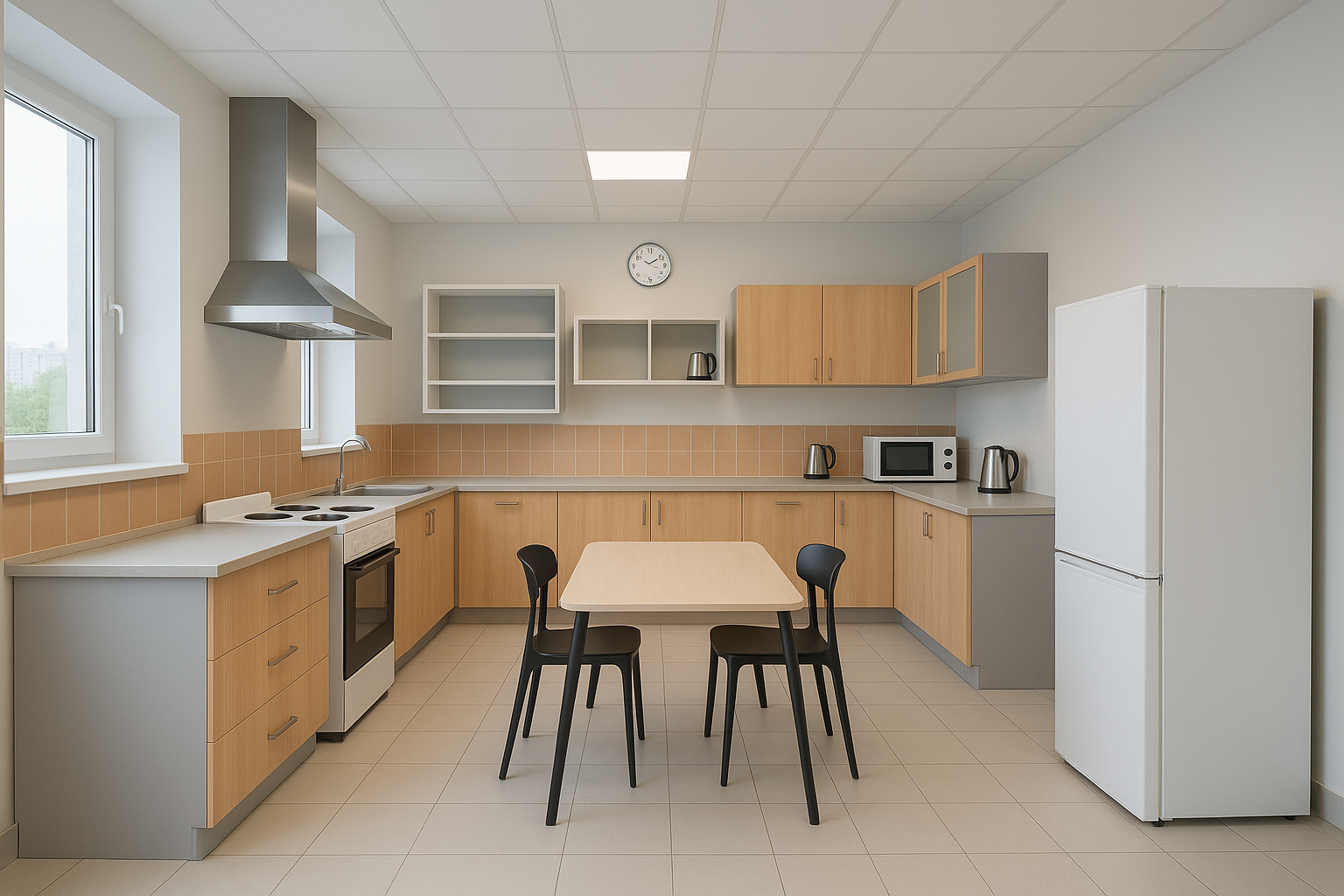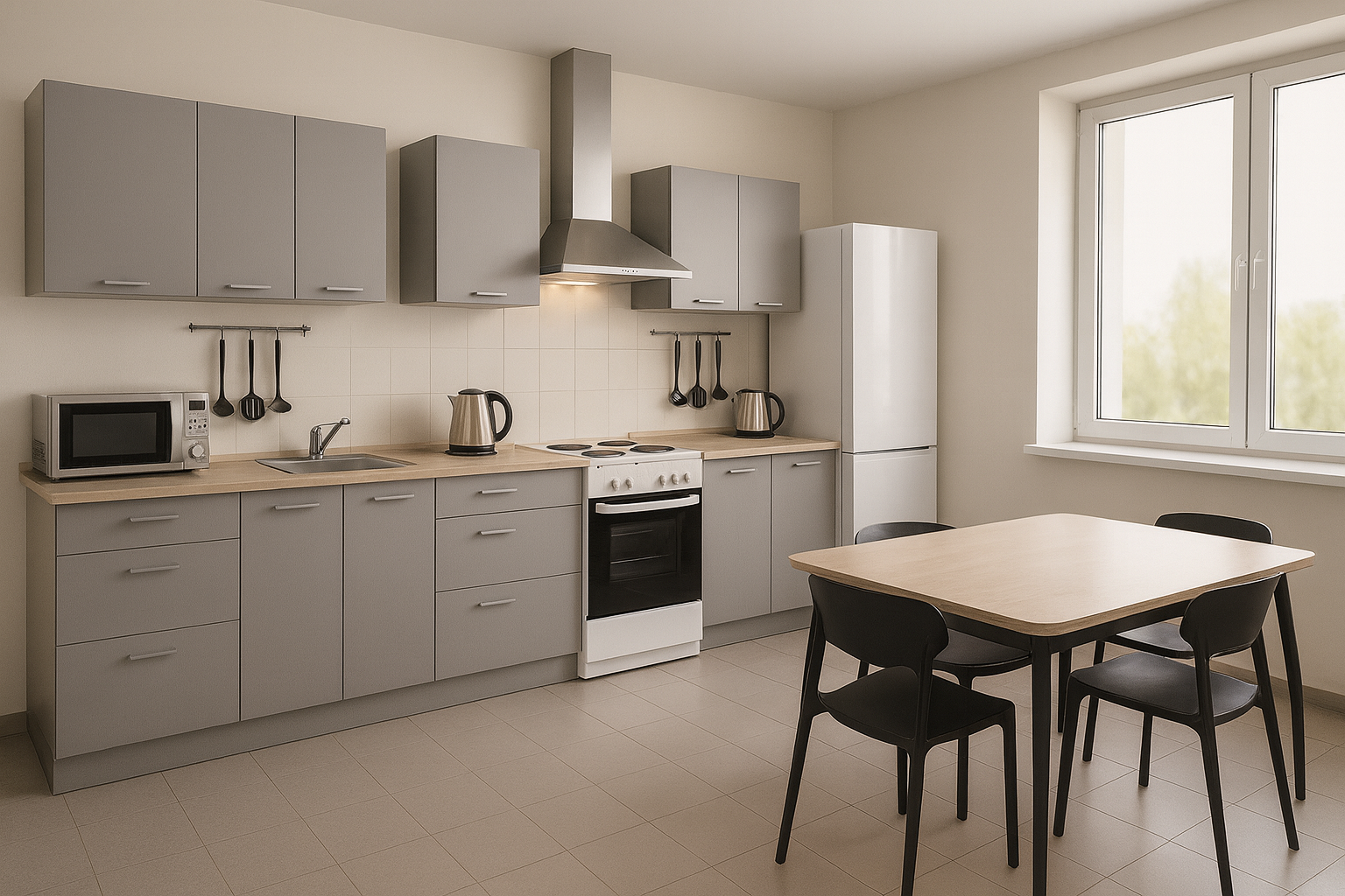 Кухня общего пользования представлена в двух современный вариантах оформления, чтобы идеально подойти под разные стилевые решения общежития. Оба пространства оснащены удобной мебелью, продуманными рабочими зонами и полной бытовой комплектацией — от плиты и холодильника до микроволновой печи и вытяжки.