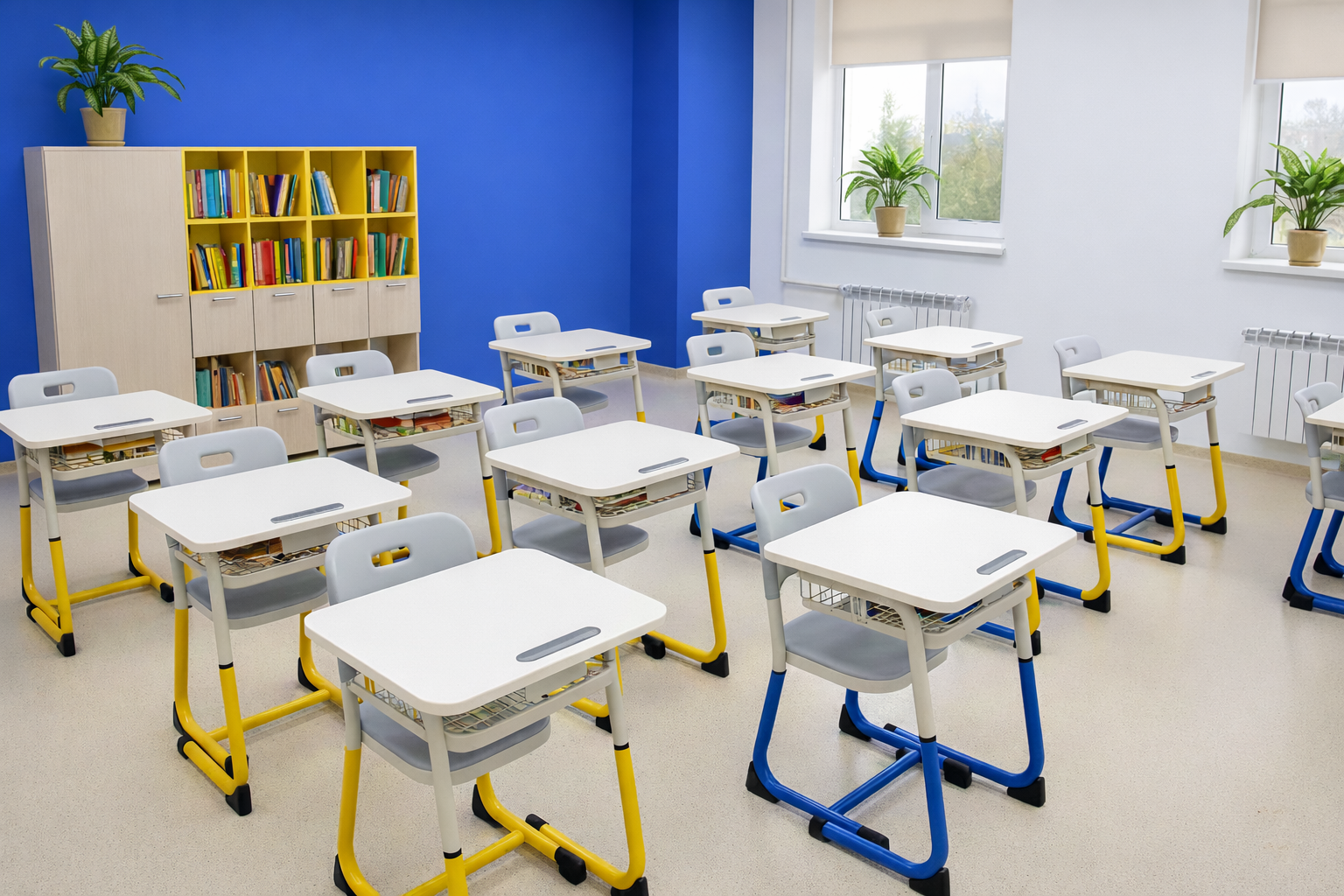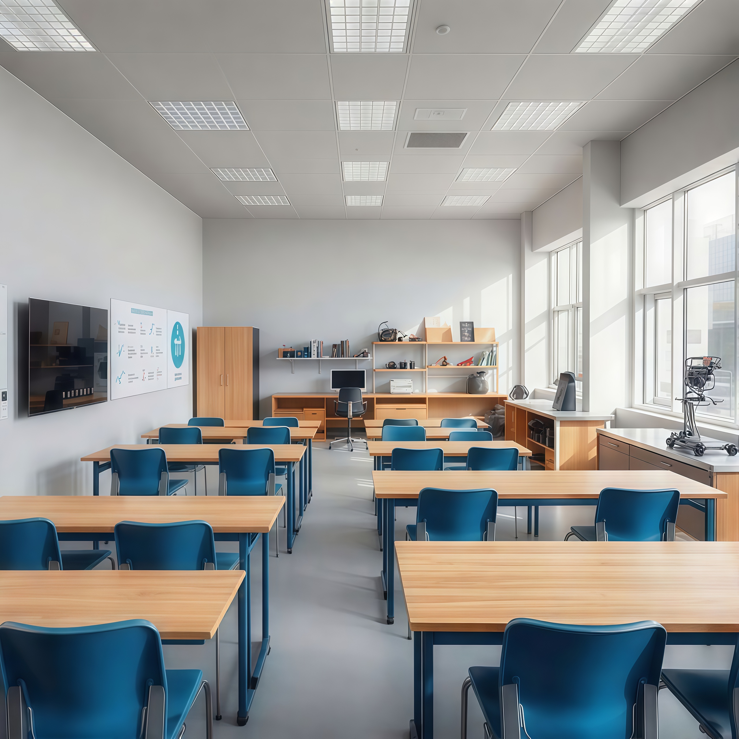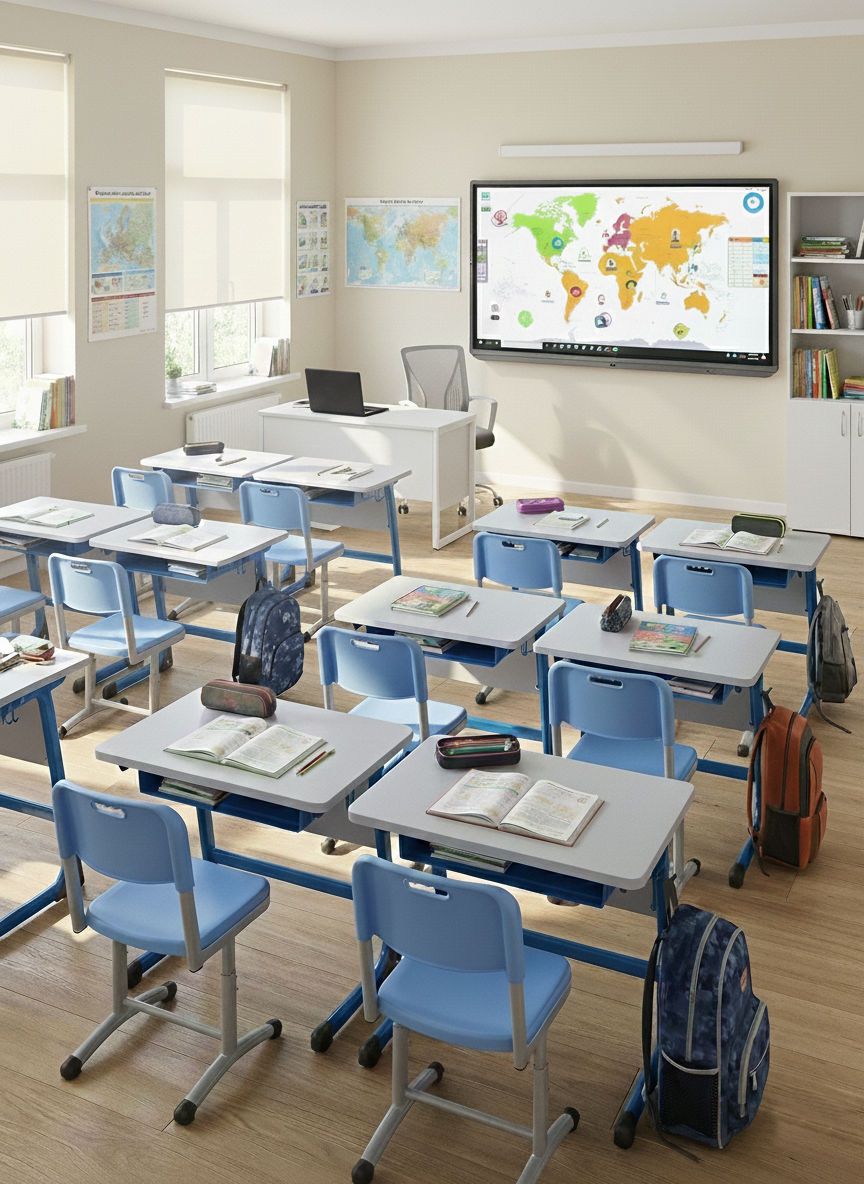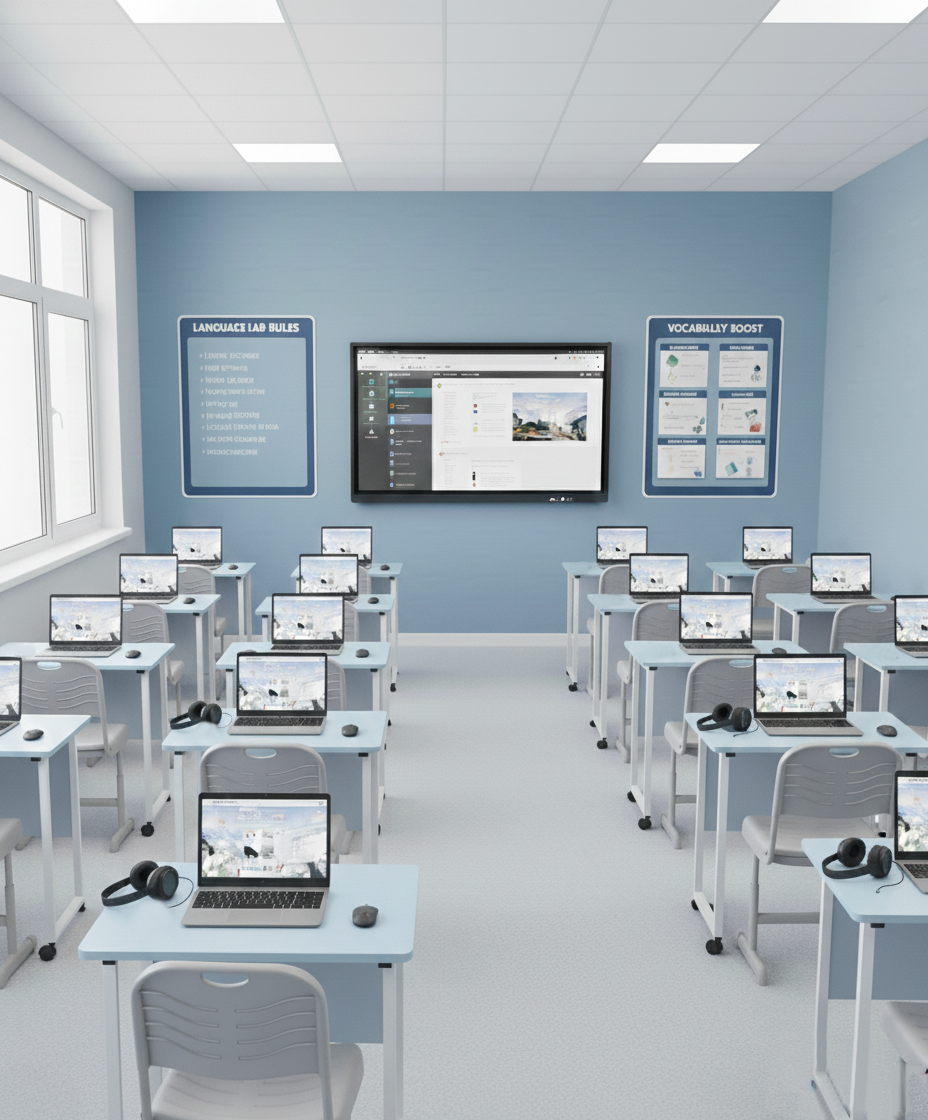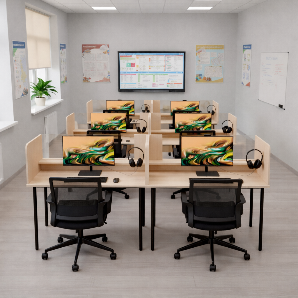Пространство организовано с учётом эргономики и образовательных стандартов, включает индивидуальные рабочие места для учеников и зону преподавателя с централизованным управлением.