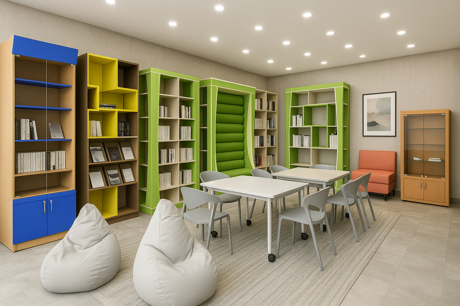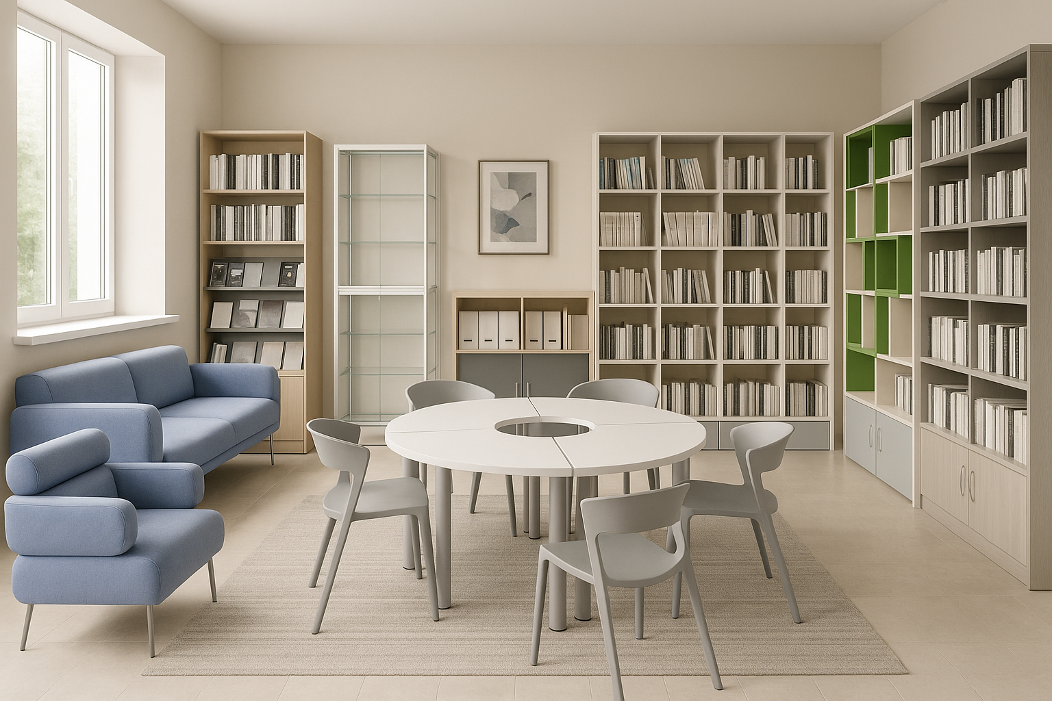 Современная зона для чтения и отдыха, оснащённая удобной мебелью и функциональными стеллажами для хранения литературы.