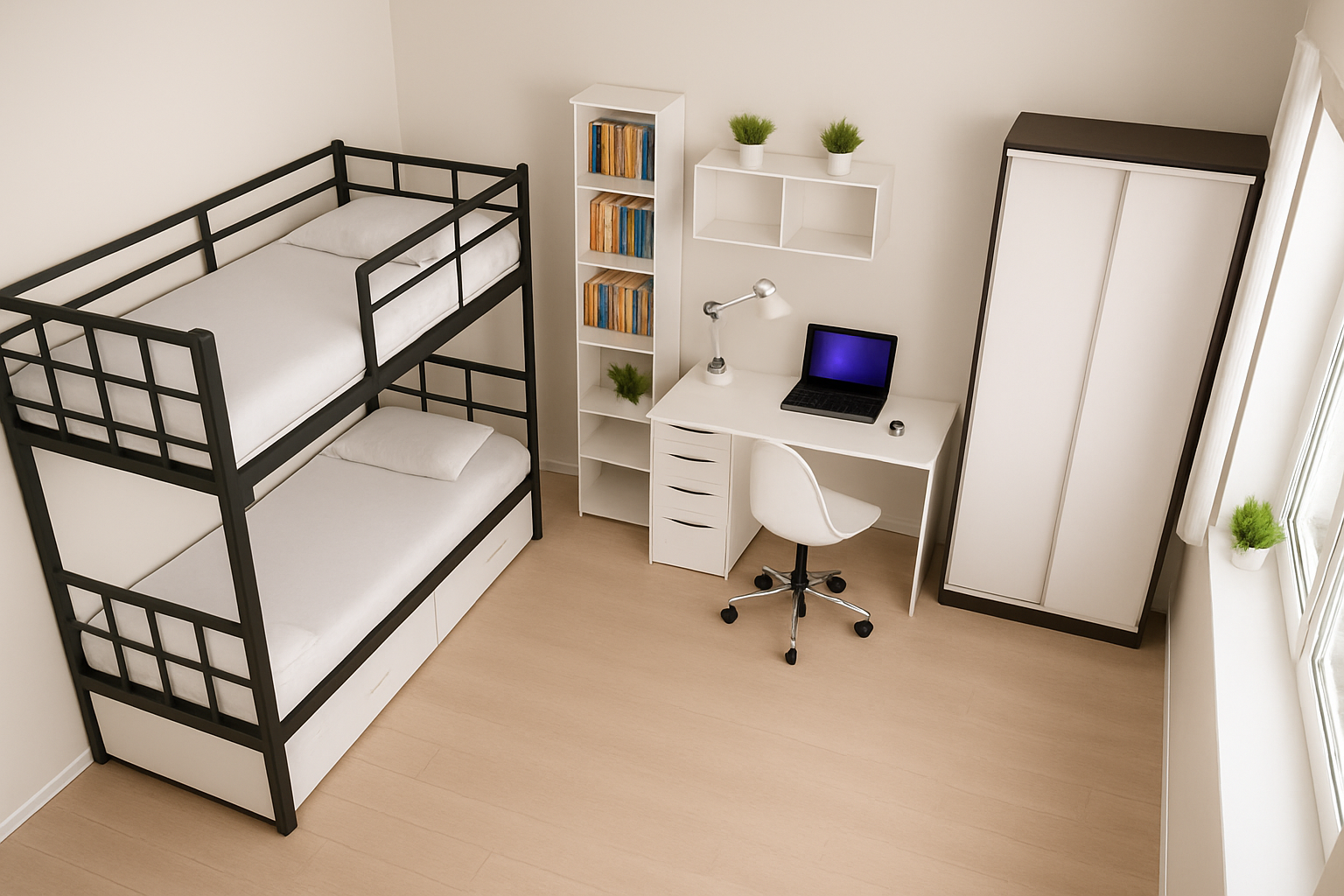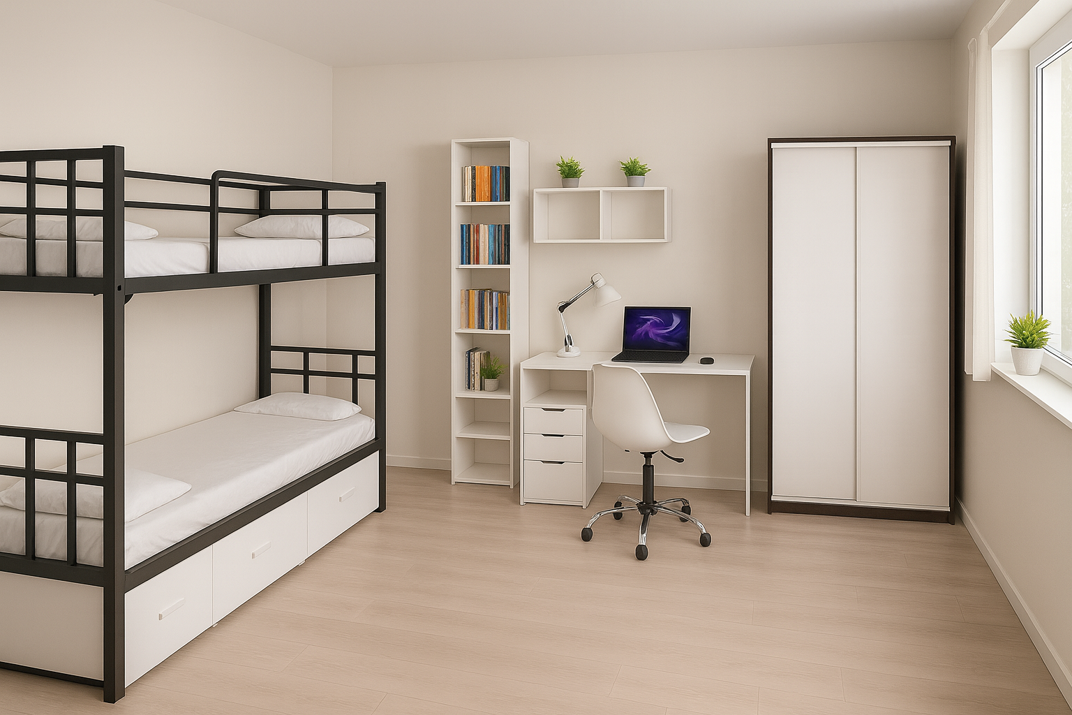 Современная жилая комната общежития оформлена в светлом минималистичном стиле и продумана до мелочей.