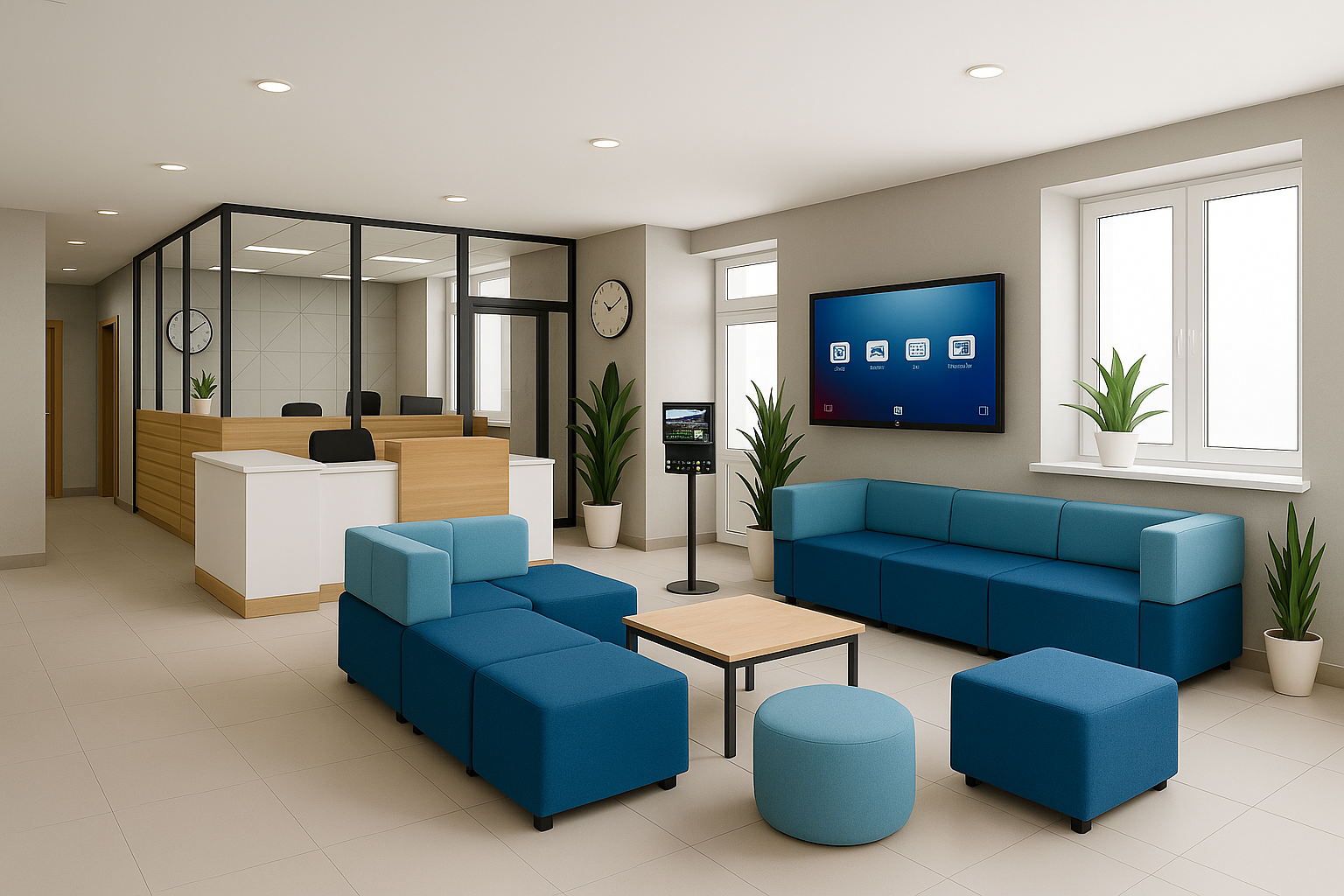 Стильная входная зона общежития сочетает в себе комфорт, функциональность и современный дизайн. Модульная мягкая мебель формирует удобное пространство для ожидания, а оснащённая зона ресепшн обеспечивает оперативную коммуникацию с персоналом.