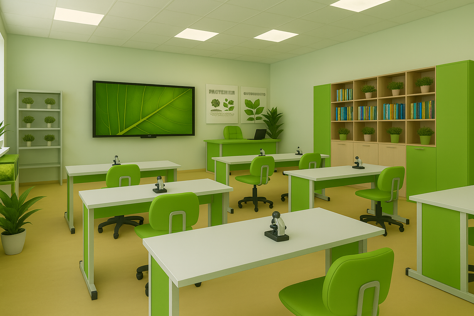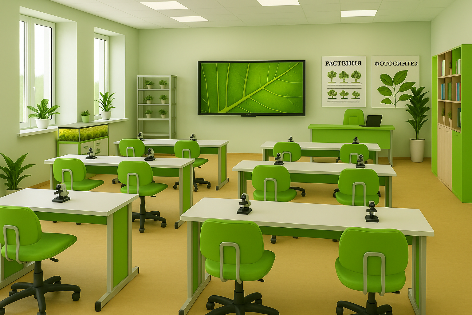 Оснащён в соответствии с современными образовательными стандартами: рабочие места учащихся оборудованы микроскопами, предусмотрены зоны хранения, демонстрационная мебель, мультимедийное оборудование и фитостеллажи.