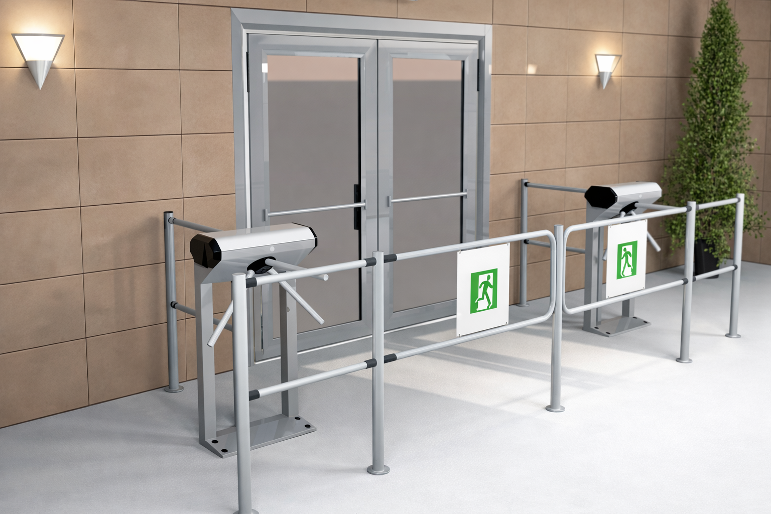 Проект предусматривает четкое зонирование пространства с разделением входных и выходных потоков, размещение турникетов и поста охраны.