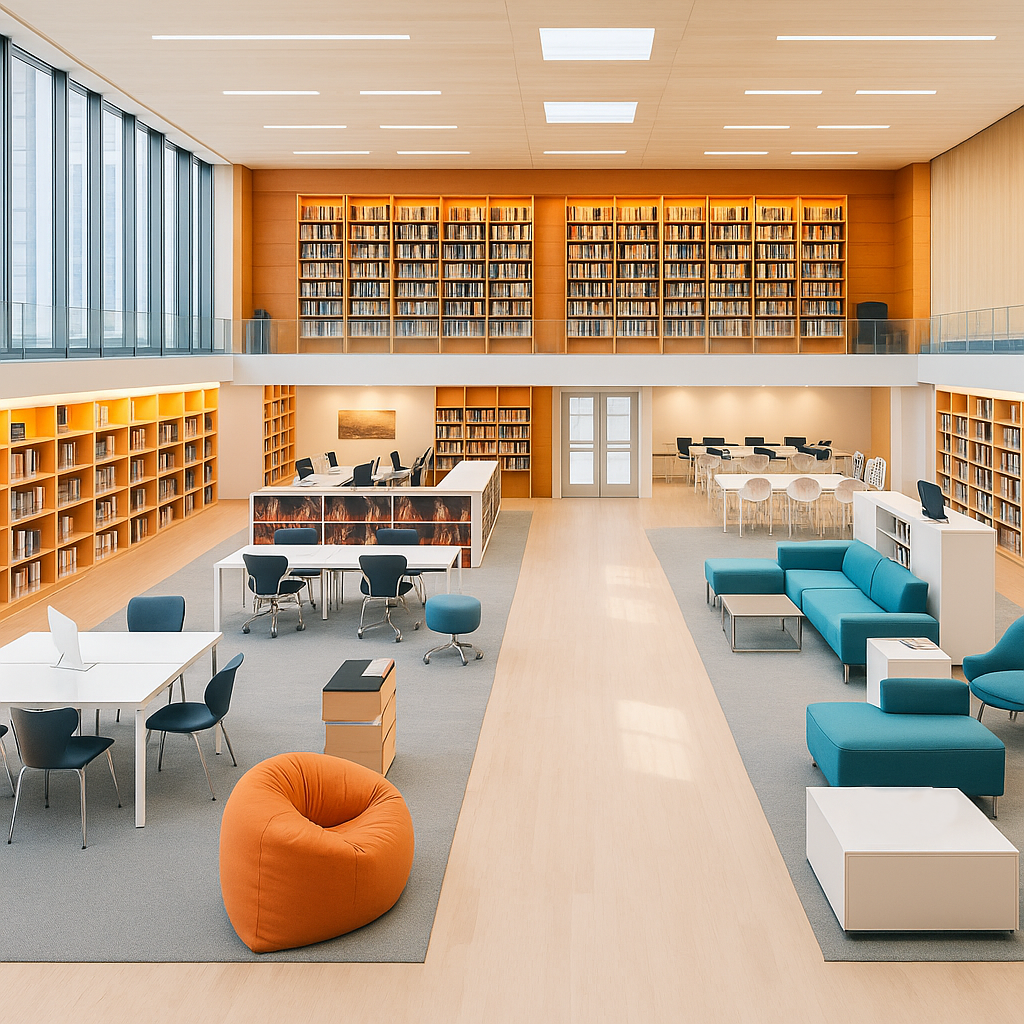 Стильные книжные стеллажи, удобные диваны и пуфы, современные столы и эргономичные стулья формируют гибкую среду для чтения, обучения и общения. Пространство легко адаптируется под разные сценарии — от индивидуальной работы до лекций и встреч.